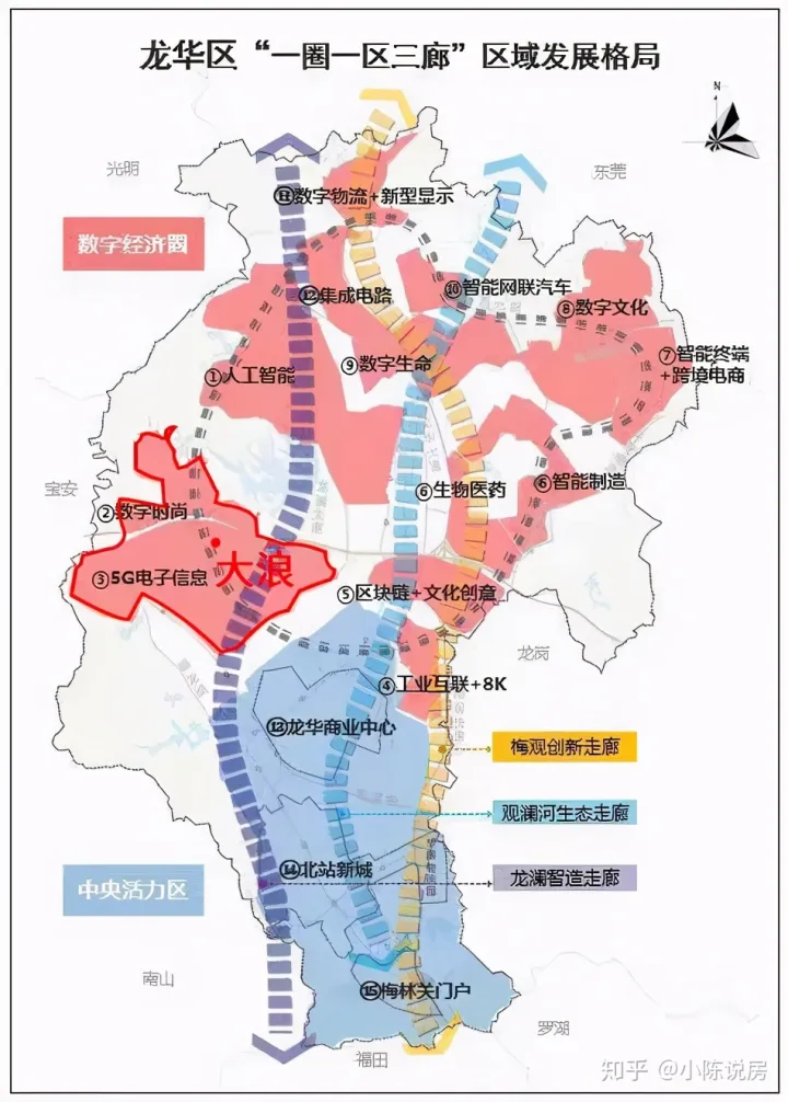看右图,红色标注的范围为大浪,北面的数字时尚产业和南面的5G高新科技产业强强联合,将大浪重要地区覆盖的严严实实,是龙岗的核心发动机之一。