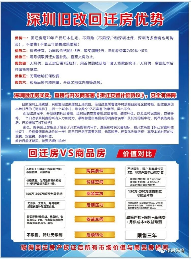 A老先生说,一开始,他也不光不认知旧改投资,心里也有不光多的顾虑。明明地产商要赔货品房,可为何除了村民愿意低价卖掉呢?网络上很多大V,即使律师,都在讲小产权、征地房的各种陷阱,政府也一直在打击小产权房买卖,可为何除了那么多人买呢?货品房限牌如此严格,为何旧改迁离房却可以不限户口、社保、名额,即使不受限售政策限制呢?除了诸如安全、地产商、政策、环境等潜在风险因素问题等等,内心也是十分抗拒的!