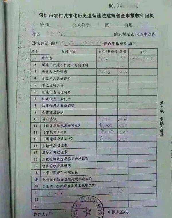 《深圳市农村城市化历史遗留违法建筑普查申报收件回执》